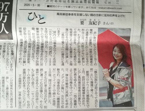 こんにちは 先週末、私は実家に帰省していた。 そのときのこと。 母が、新聞を手に「この記事を読んでみてよ」と言ってきた。 こういうことは初めてのことで、何事かと読んでみた。 5月30日付朝日新聞朝刊の「ひと」という囲み記事。 「風俗業従事者を支援し…